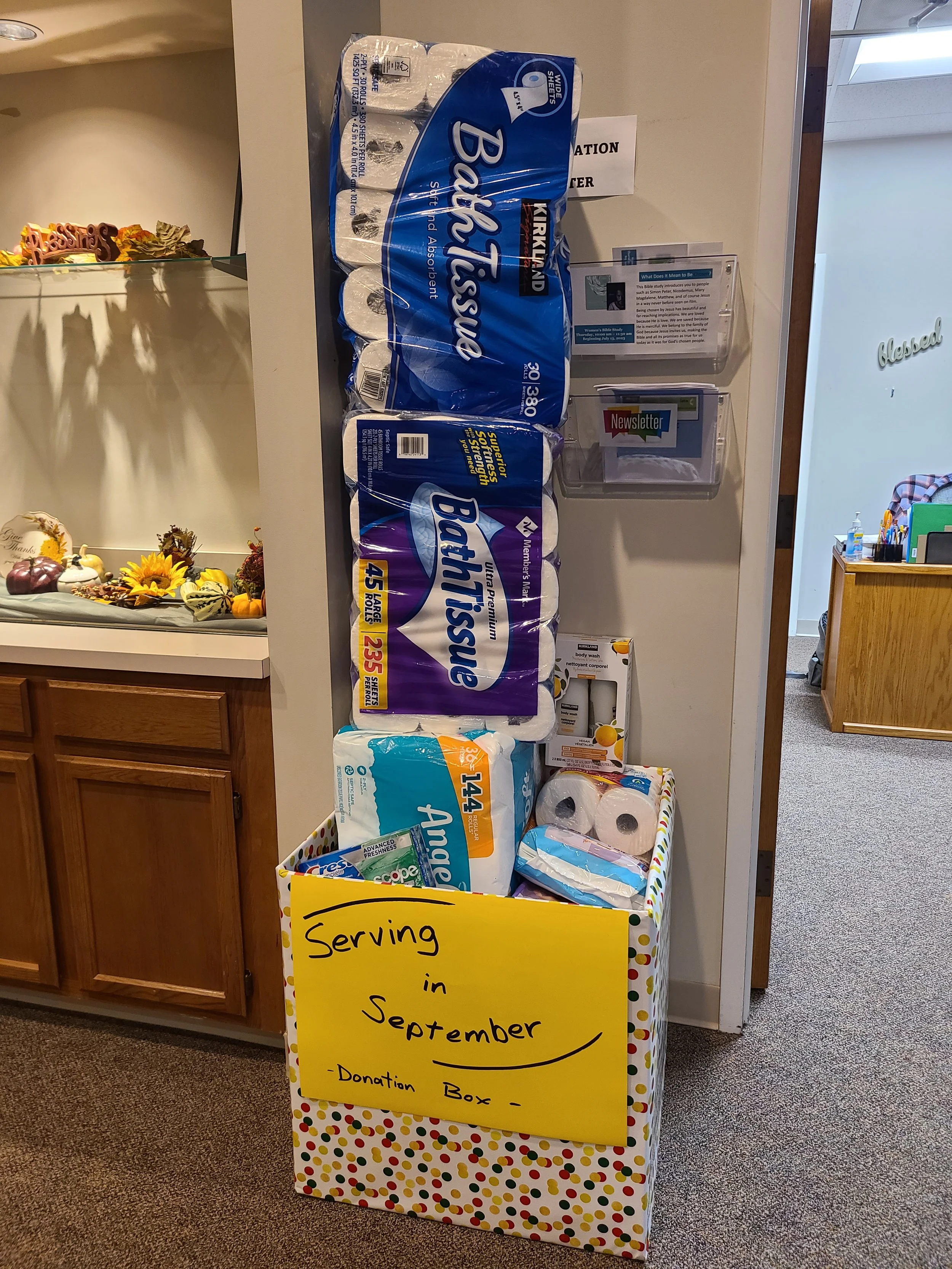 Throughout September we are collecting Toilet Paper to benefit our local food pantry and Body Wash/Shampoo to benefit Open Door Mission.
